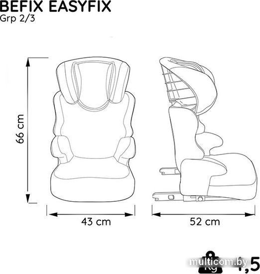 | Информация | Автокресло BEFIX EASYFIX устанавливается в автомобиле с помощью креплений Isofix. Ребенок пристегивается непосредственно штатным ремнем безопасности. По мере роста ребенка подголовник регулируется по высоте в нескольких положениях. Автокресло BEFIX EasyFix имеет защиту от бокового удара. |