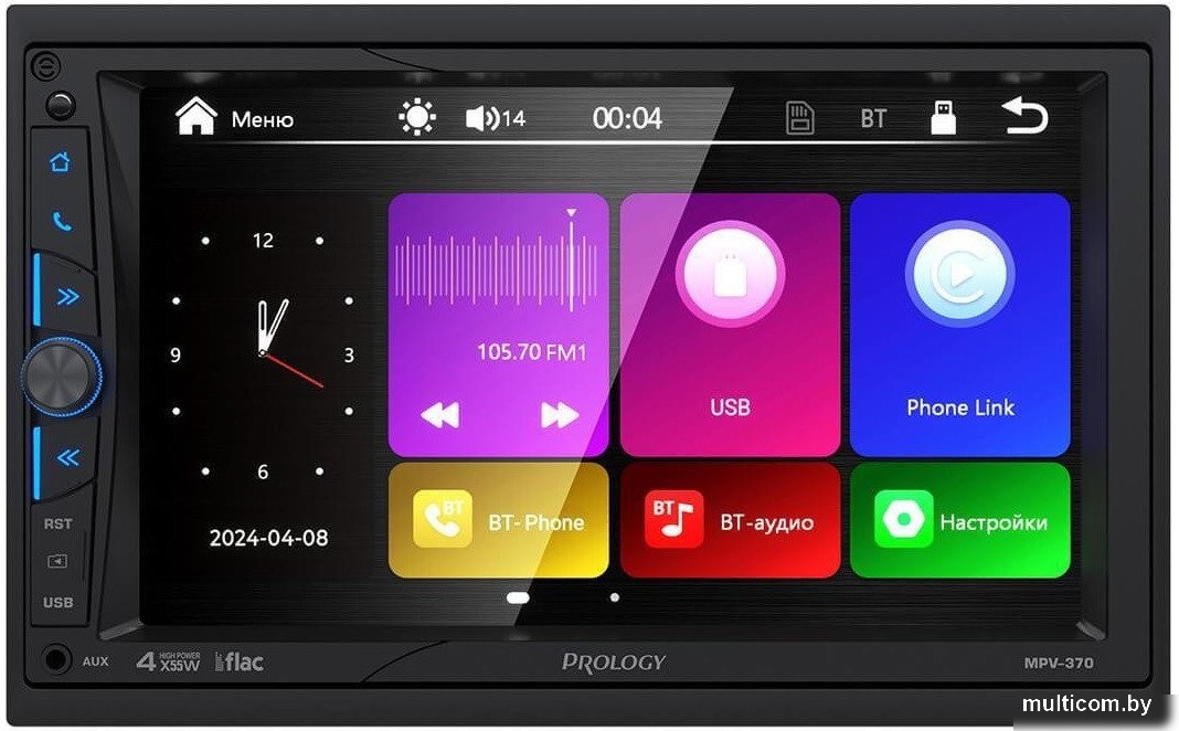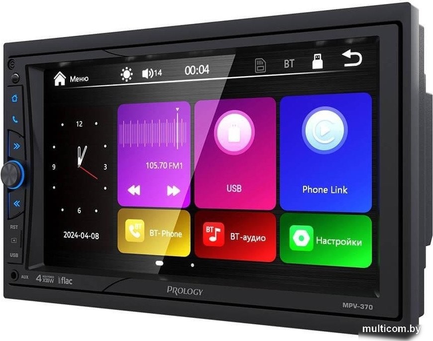 | Информация | - Автомобильный мультимедийный центр PROLOGY MPV-370 монтажного размера 2DIN обеспечивает прием радиостанций в диапазонах FM / УКВ, воспроизведение медиафайлов, записанных на карты памяти USB / microSD, передачу сигнала с внешних источников, а также управление мобильным телефоном через интерфейс Bluetooth (version 4.2). - Поддерживается подключение штатных кнопок управления аудиосистемой на руле (интерфейс SWC). |