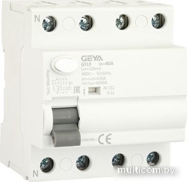 | Информация | GEYA - УЗО GYL9-4P-40A-100mA, 4P, 40A, 6 kA, 100mA, тип AC, 4M - Артикул: GYL94P40AC100 |