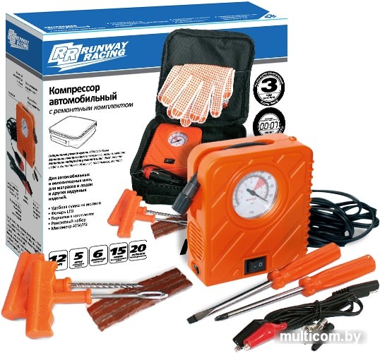| Комплект поставки | Компрессор:1. Электрический кабель, подключаемый к гнезду прикуривателя 12В2. Электрический кабель, подключаемый к клеммам аккумулятора 12В3. Сменные насадки для накачки мячей, лодок и т.п.4. Сумка на молнииРемонтный набор:1. Перчатки2. Канцелярский нож3. Длинногубцы4. Набор для ремонта бескамерных шин |