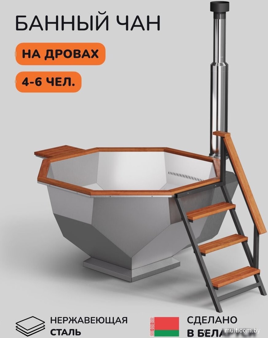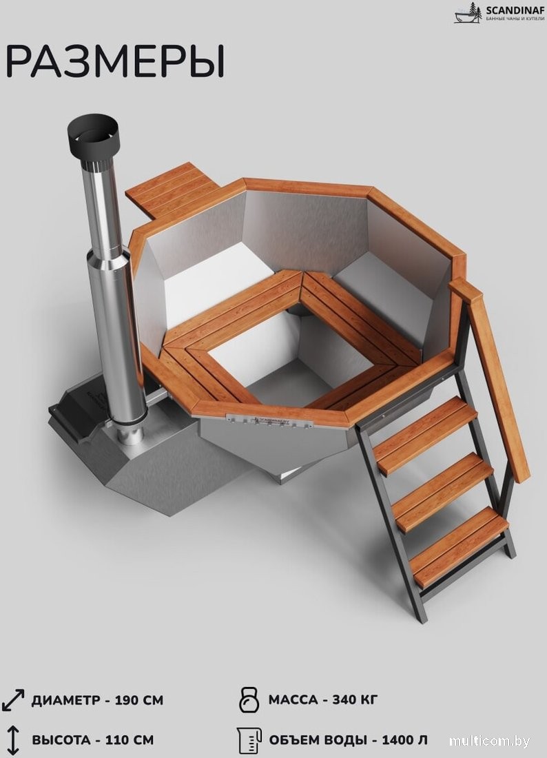 | Информация | Банный чан на дровах SCANDINAF – это премиальный уличный банный чан, созданный для максимально комфортного парения на вашем участке круглый год. Чан выполнен из нержавеющей стали толщиной 2 и 3 мм, с большим запасом прочности, что позволяет использовать его в различных экстремальных температурных и погодных условиях. Сварные швы выполнены аппаратом лазерной сварки и обработаны специальным составом пассивирования, что защищает чан от коррозии и продлевает минимальный срок службы от 10 лет. Поверхность чана обработана методом сатинирования, что придает металлу эстетичный вид и защищает от царапин. Дровяная печь с водяной рубашкой из нержавеющей стали толщиной 3 мм, выполнена по технологии водяной рубашки и подового горения, что позволяет быстро и безопасно нагреть воду в банном чане до необходимой температуры менее чем за 2 часа. У основания печи расположен сливной кран, чтобы можно было быстро слить воду из чана. С обратной стороны к печи крепится сэндвич-дымоход, который отделяет горячую трубу от прикосновений, тем самым убирает риск обжечься о металл. Составной дымоход изготовлен из нержавеющей стали толщиной 1 мм, что предотвращает постепенное прогорание дымохода, а дефлектор с ветрозащитой и искрогасителем защищает дымоход от осадков, а территорию вокруг чана от продуктов горения, искр и пепла. Окантовочная доска по периметру, а также сидушки и лестница выполнены из термодревесины. Данное дерево хорошо переносит влажность и постоянное нахождение в воде, не рассыхается и не гниет, а также обладает приятным ароматом. Опора чана изготовлена из профильной трубы толщиной 2 мм, квадратного сечения. Конструкция опоры имеет большой запас прочности и рассчитана на вес, в несколько раз превышающий вес банного чана с водой и людьми внутри. Все чертежи и элементы наших банных чанов разработаны в нашем конструкторском отделе на специальном программном обеспечении совместно с командой дизайнеров, что позволяет сочетать оптимальную форму, технологии, а также эстетичный внешний вид банного чана на вашем загородном участке. Наше производство банных чанов расположено в Беларуси и отвечает всем современным стандартам качества и безопасности. Лазерное, листогибочное и сварочное оборудование Trumpf (Германия) – это самые современные и технологичные станки в нашем металлообрабатывающем цеху. Высокая точность, надежность и автоматизация лежит в изготовлении наших банных чанов. На участке упаковки чан обматывается в несколько слоев пузырчатой пленки и картона, с защитой всех комплектующих и углов, а также помещается в деревянную обрешетку, чтобы гарантировать надежную транспортировку к вам на участок. В каждом изделии от нас вы найдете приятные подарки в виде набора для парения, небольшого деревянного столика, чтобы находится в чане вместе с вашими любимыми напитками, полотенцедержателя и термокрышки. Банные чаны и купели на дровах SCANDINAF серии Comfort, Furako, Diamond и Elite – диаметром 170, 190 и 200 см рассчитаны на использование до 10 чел. Использование банных чанов зимой позволит вам окунуться в незабываемую атмосферу целого СПА комплекса на вашем участке, а летом подарит приятную прохладу телу в жару и возможность детям резвится в воде целый день. Различные комплектации и формы нашей серии позволят вам выбрать лучший банный чан SCANDINAF