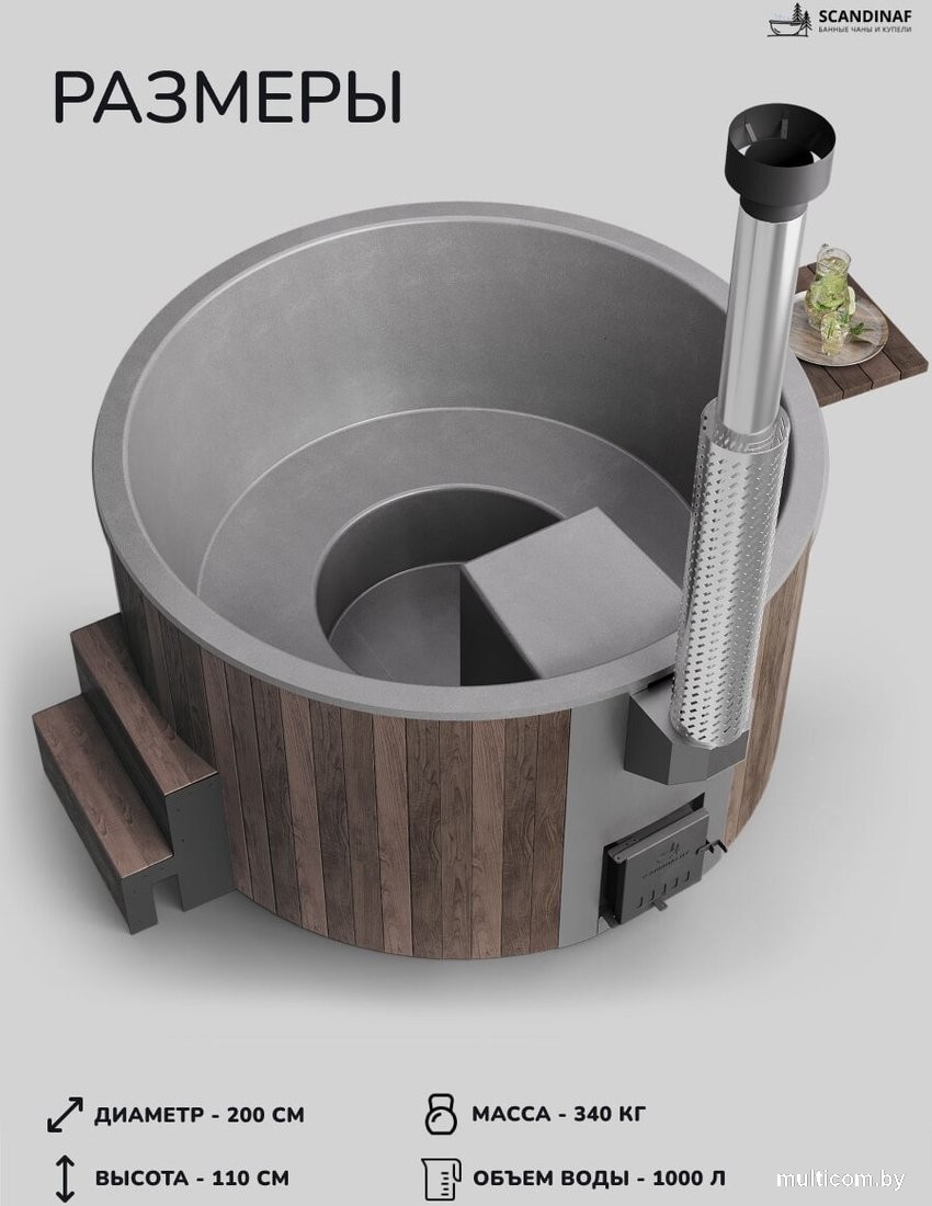 ИнформацияБанный чан на дровах SCANDINAF – это премиальный уличный банный чан, созданный для максимально комфортного парения на вашем участке круглый год.