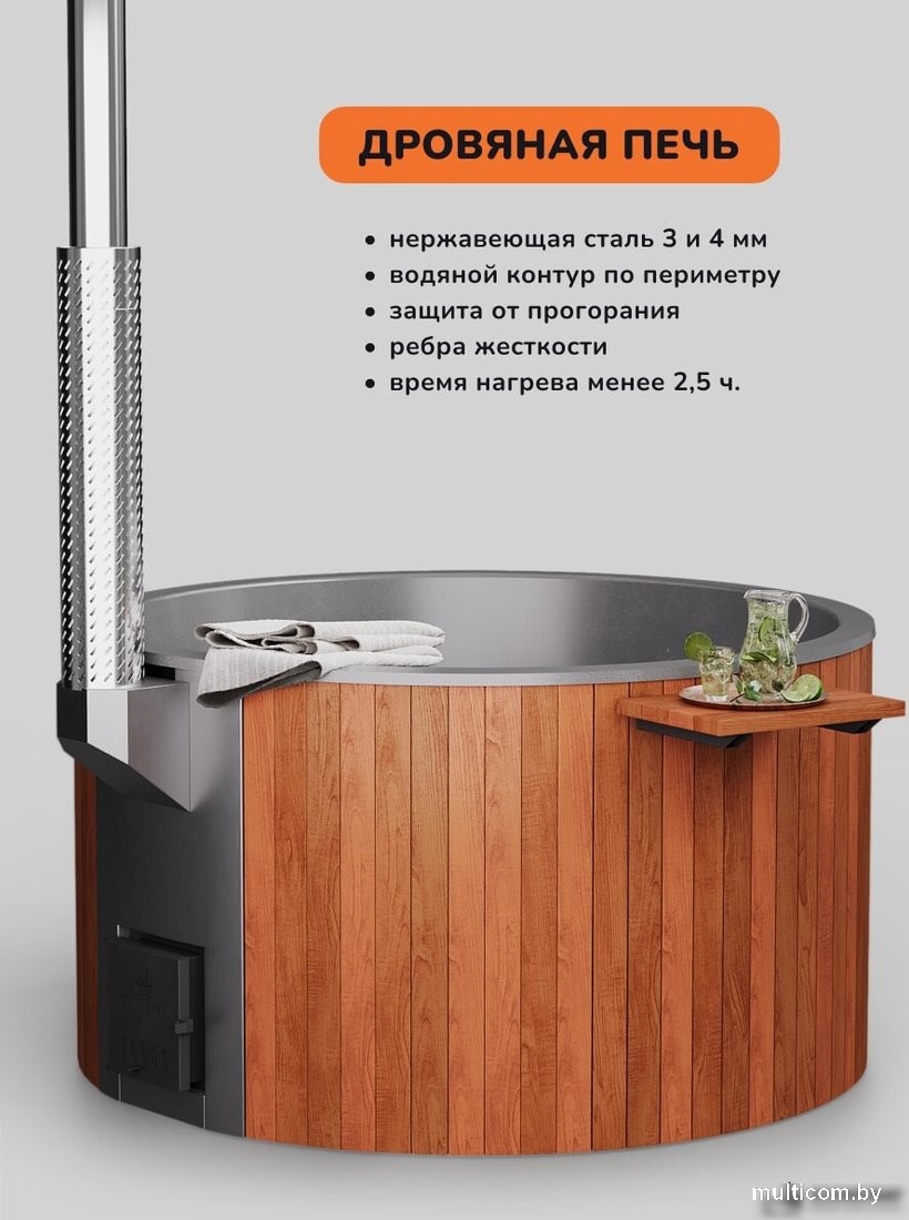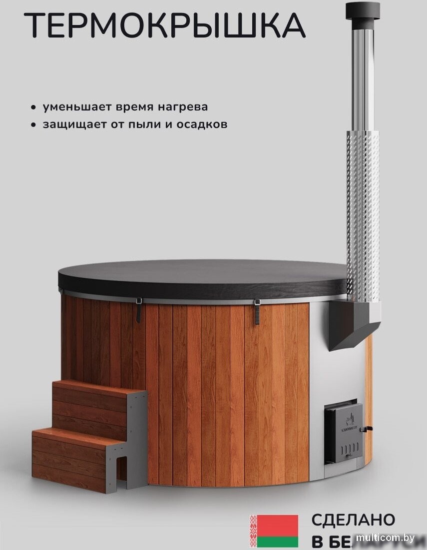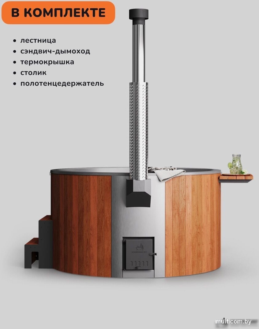 | Информация | Банный чан на дровах SCANDINAF – это премиальный уличный банный чан, созданный для максимально комфортного парения на вашем участке круглый год. Чан выполнен из нержавеющей стали толщиной 2 и 3 мм, с большим запасом прочности, что позволяет использовать его в различных экстремальных температурных и погодных условиях. Сварные швы выполнены аппаратом лазерной сварки и обработаны специальным составом пассивирования, что защищает чан от коррозии и продлевает минимальный срок службы от 10 лет. Поверхность чана обработана методом сатинирования, что придает металлу эстетичный вид и защищает от царапин. Дровяная печь с водяной рубашкой из нержавеющей стали толщиной 3 мм, выполнена по технологии водяной рубашки и подового горения, что позволяет быстро и безопасно нагреть воду в банном чане до необходимой температуры менее чем за 2 часа. У основания печи расположен сливной кран, чтобы можно было быстро слить воду из чана. С обратной стороны к печи крепится сэндвич-дымоход, который отделяет горячую трубу от прикосновений, тем самым убирает риск обжечься о металл. Составной дымоход изготовлен из нержавеющей стали толщиной 1 мм, что предотвращает постепенное прогорание дымохода, а дефлектор с ветрозащитой и искрогасителем защищает дымоход от осадков, а территорию вокруг чана от продуктов горения, искр и пепла. Окантовочная доска по периметру, а также сидушки и лестница выполнены из термодревесины. Данное дерево хорошо переносит влажность и постоянное нахождение в воде, не рассыхается и не гниет, а также обладает приятным ароматом. Опора чана изготовлена из профильной трубы толщиной 2 мм, квадратного сечения. Конструкция опоры имеет большой запас прочности и рассчитана на вес, в несколько раз превышающий вес банного чана с водой и людьми внутри. Все чертежи и элементы наших банных чанов разработаны в нашем конструкторском отделе на специальном программном обеспечении совместно с командой дизайнеров, что позволяет сочетать оптимальную форму, технологии, а также эстетичный внешний вид банного чана на вашем загородном участке. Наше производство банных чанов расположено в Беларуси и отвечает всем современным стандартам качества и безопасности. Лазерное, листогибочное и сварочное оборудование Trumpf (Германия) – это самые современные и технологичные станки в нашем металлообрабатывающем цеху. Высокая точность, надежность и автоматизация лежит в изготовлении наших банных чанов. На участке упаковки чан обматывается в несколько слоев пузырчатой пленки и картона, с защитой всех комплектующих и углов, а также помещается в деревянную обрешетку, чтобы гарантировать надежную транспортировку к вам на участок. В каждом изделии от нас вы найдете приятные подарки в виде набора для парения, небольшого деревянного столика, чтобы находится в чане вместе с вашими любимыми напитками, полотенцедержателя и термокрышки. Банные чаны и купели на дровах SCANDINAF серии Comfort, Furako, Diamond и Elite – диаметром 170, 190 и 200 см рассчитаны на использование до 10 чел. Использование банных чанов зимой позволит вам окунуться в незабываемую атмосферу целого СПА комплекса на вашем участке, а летом подарит приятную прохладу телу в жару и возможность детям резвится в воде целый день. Различные комплектации и формы нашей серии позволят вам выбрать лучший банный чан SCANDINAF
