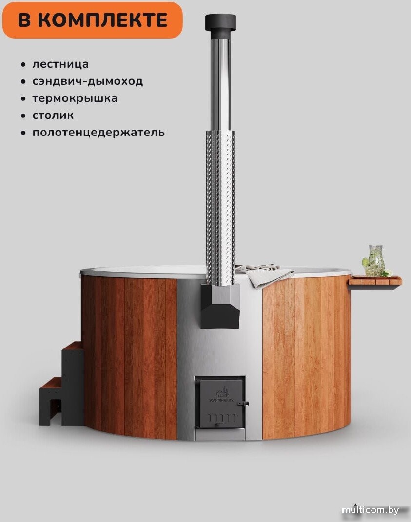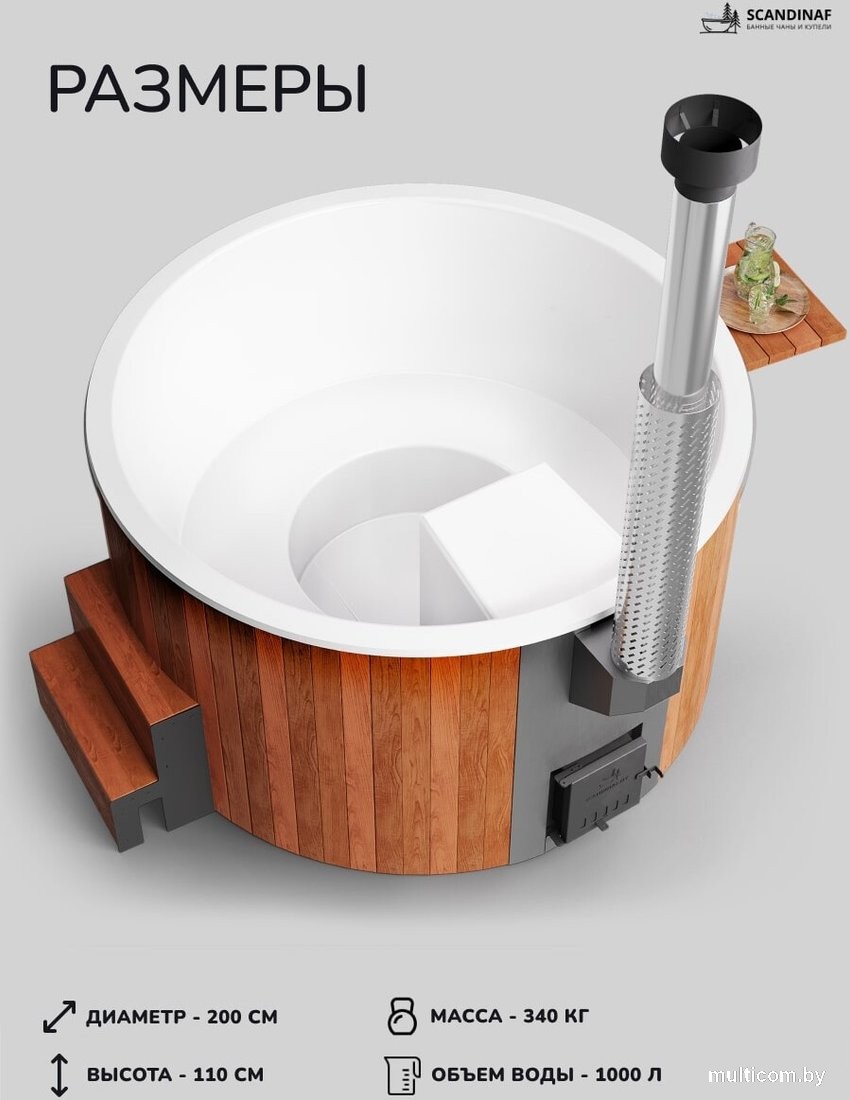 ИнформацияБанный чан на дровах SCANDINAF – это премиальный уличный банный чан, созданный для максимально комфортного парения на вашем участке круглый год.