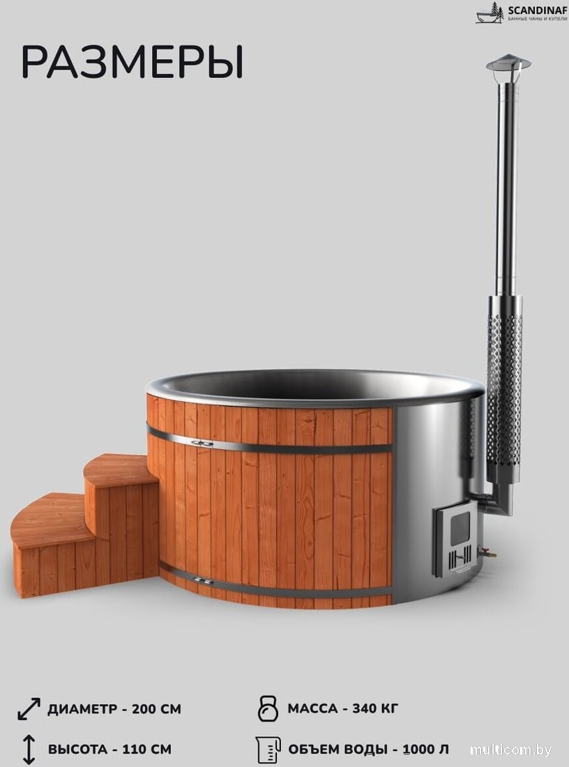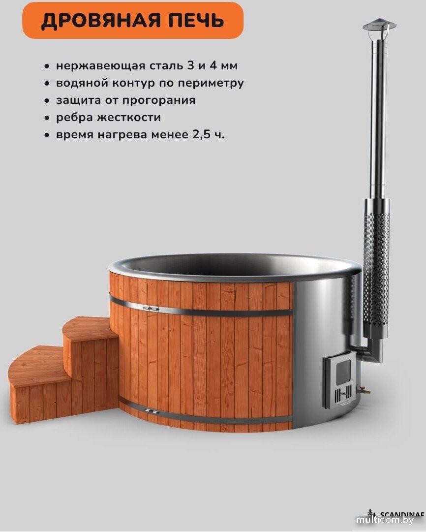 ИнформацияБанный чан на дровах SCANDINAF – это премиальный уличный банный чан, созданный для максимально комфортного парения на вашем участке круглый год.