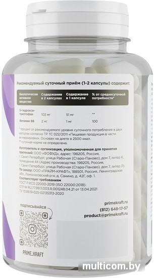 | Состав | микрокристаллическая целлюлоза – носитель желатиновая капсула (желатин – загуститель, вода, диоксид титана – краситель), экстракт гриффонии (5-гидроксиптофан), пиридоксина гидрохлорид (витамин B6). |