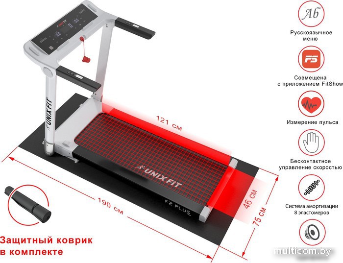 | Особенности | Модель Hi-Tech F2 Plus - сочетание компактности и стильного дизайна, а также это идеальный вариант для тех, кто хочет повысить свою выносливость, сбросить лишний вес, а также поддерживать в тонусе сердечно-сосудистую систему. Дорожка обладает инновационной функцией “NO TOUCH CONTROL”, которая с помощью инфракрасного датчика позволяет пользователю бесконтактно изменять скорость во время тренировки, а так же установить нужный параметр целевой тренировки (расстояние, калории и время тренировки). Трехслойное беговое полотно размером 121х46 см оптимально подходит как для ходьбы, так и для интенсивных беговых тренировок. Тщательно разработанная система амортизации снижает нагрузку на позвоночник и суставы. Транспортировочные ролики позволяют перемещать дорожку в удобное для вас место, а компактная система складывания хранить в вертикальном или горизонтальном положении. Вес беговой дорожки Hi-Tech F2 Plus составляет 45 |