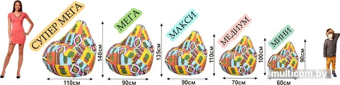 | Информация | Мини (60х90см) - для детей ростом до 90см.Медиум (70х100см) - для детей ростом до 130см.Макси (90х110см) - оптимален для любого роста.Мега (90х135см) - для людей ростом от 175см.Супер мега (110х140см) - для людей ростом от 180см.Длина измеряется по шву |