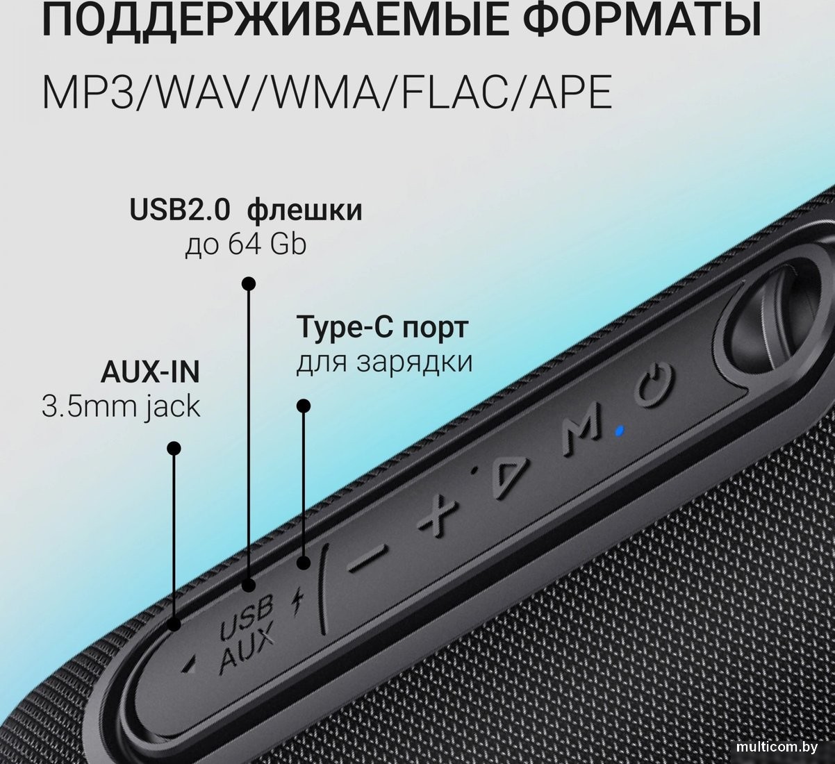 | Информация | - Портативная колонка Digma D-PS1524 — это компактное решение для прослушивания музыки дома, на природе или в путешествии. Благодаря двум динамикам диаметром 2" и поддержке современных аудиоформатов MP3, WAV, WMA, FLAC, APE, вы сможете наслаждаться качественным звуком в любом удобном месте. - Устройство оснащено Bluetooth 5.3 для беспроводного подключения к смартфонам, планшетам и другим гаджетам, а также поддерживает воспроизведение музыки с USB-накопителей объемом до 64 ГБ. Для удобства предусмотрен и стандартный аудиовход 3.5 мм, что расширяет возможности подключения. - Колонка работает от встроенного аккумулятора и обеспечивает до 7 часов непрерывного воспроизведения музыки. Зарядка осуществляется через современный разъем USB Type-C. Встроенная функция TWS позволяет синхронизировать две колонки для создания стереопары. - Digma D-PS1524 выделяется эффектной LED-подсветкой динамиков и поддерживает режим громкой связи (спикерфон) благодаря встроенному микрофону. Корпус выполнен из пластика с тканевой обтяжкой, что делает колонку стильной и приятной на ощупь. |