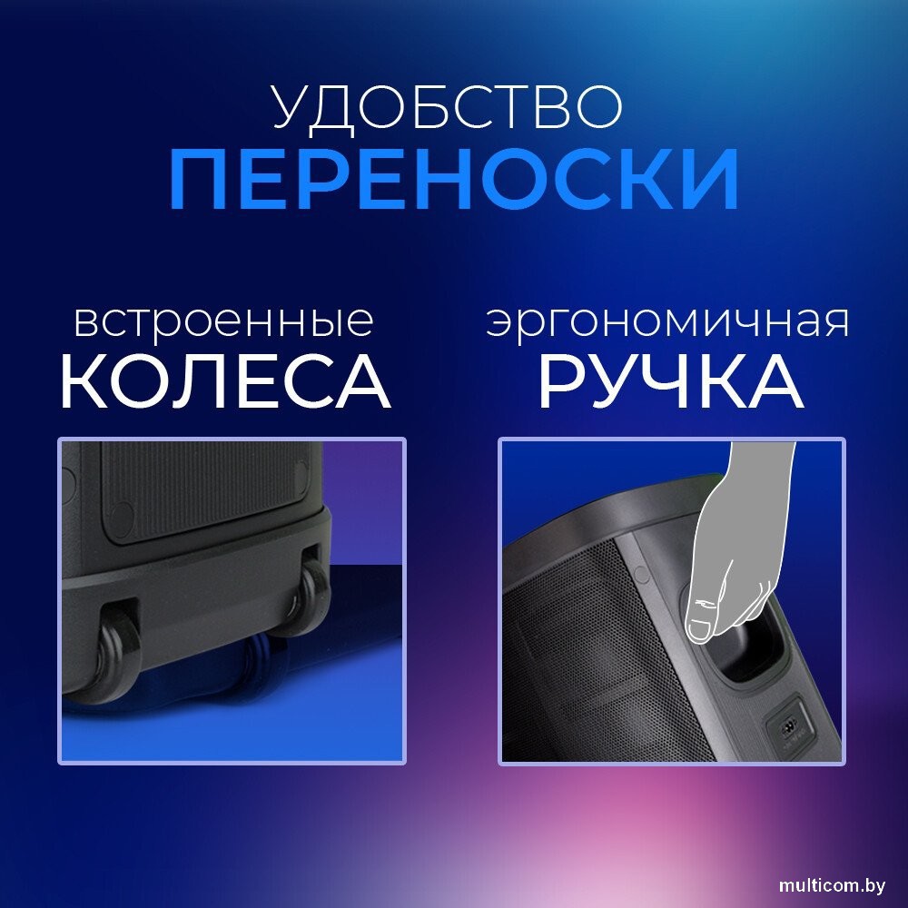 | Информация | -Ключевые характеристики Портативная акустическая система с поддержкой Bluetooth 5.0, двумя 8-дюймовыми низкочастотными и двумя 2.5-дюймовыми высокочастотными динамиками, частотным диапазоном 30 - 22000 Гц и аккумулятором емкостью 9000 мАч рассчитана на проведение вечеринок, караоке и мобильные развлечения. Устройство оснащено защитой от брызг по стандарту IPX4, LED-подсветкой и FM-радио. -Преимущества и отличия Модель выделяется возможностью воспроизведения музыки с USB-флешек и microSD-карт, наличием гитарного и микрофонного входов, а также функцией PowerBank для зарядки внешних устройств. Дополнительно реализована функция беспроводного объединения колонок в стереопару и поддержка различных режимов эквалайзера и басового усиления. -Практичность Благодаря встроенной ручке и колесам устройство легко транспортировать, а информативный LED-дисплей и пульт дистанционного управления обеспечивают удобное управление. Присутствует аудиовход 3.5 мм для подключения внешних источников, что расширяет возможности использования. Влагозащита корпуса подходит для эксплуатации на открытом воздухе. -Уникальность Система оснащена динамичной LED-подсветкой с шестью стробоскопами и поддержкой режима караоке, что делает ее отличным выбором для вечеринок и мероприятий на открытом воздухе. Возможность использовать колонку как PowerBank и поддержка гитарного входа расширяют сценарии применения, выделяя модель среди аналогов в своем классе. |