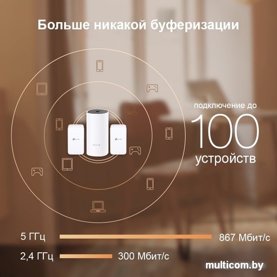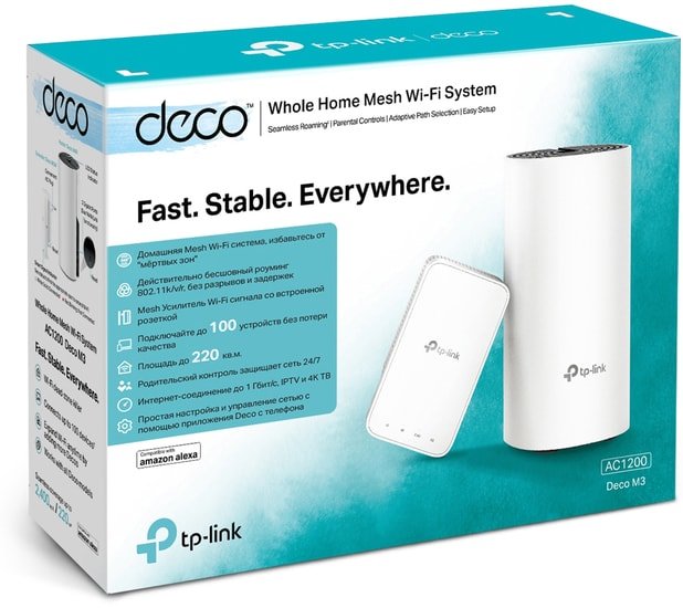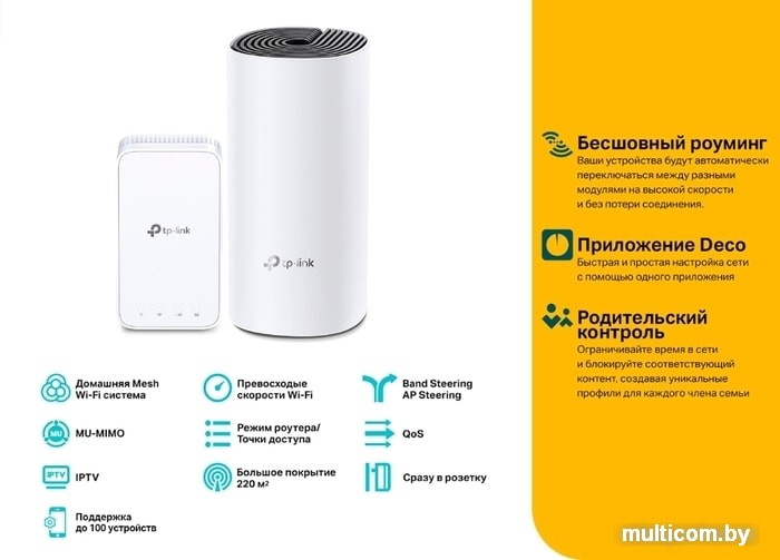 | Информация | Комплект состоит из Deco M4R и Deco M3W.Deco использует систему модулей для бесшовного Wi-Fi — раз и навсегда устраните зоны со слабым сигналом. Deco M3 с двумя устройствами (1 устройство Deco M4R и 1 усилитель Deco M3W) обеспечивает покрытие Wi-Fi на расстоянии до 223 м?. Увеличьте покрытие Mesh Wi-Fi, просто добавив больше модулей Deco M3W.Благодаря технологии Deco Mesh модули создают единую сеть Wi-Fi с одним именем. При перемещении по дому устройства будут автоматически переключаться между модулями Deco для достижения максимально возможной скорости. Deco M3 обеспечивает быстрое и стабильное подключение со скоростью до 1167 Мбит/с и работает со всеми основными интернет?провайдерами. Deco справится с передачей данных даже в самых загруженных сетях, обеспечивая непрерывное соединение не более чем для 100 устройств.Родительский контроль позволит ограничить время в сети и заблокировать нежелательный контент в соответствии с уникальными профилями, созданными для каждого члена семьи. Благодаря пошаговой инструкции в приложении Deco настройка не отнимет много времени. |