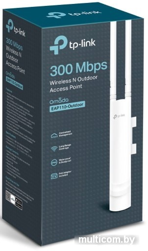 | Информация | EAP110-Outdoor обладает 2 всенаправленными съёмными антеннами – это значит, что их можно заменить на те, которые будут больше подходить вашим требованиям.Пассивное PoE позволит не подключать к точке доступа адаптеры и кабели питания – установка на улице будет быстрее и проще.EAP110-Outdoor может быть легко установлен на стене или мачте с помощью монтажных креплений, идущих в комплекте.Комплект поставки: N300 Наружная Wi-Fi точка доступа EAP110-OutdoorАдаптер пассивного PoEКабель питанияМонтажный наборВодонепроницаемая резиновая прокладкаВодонепроницаемые антенныРуководство по установке |