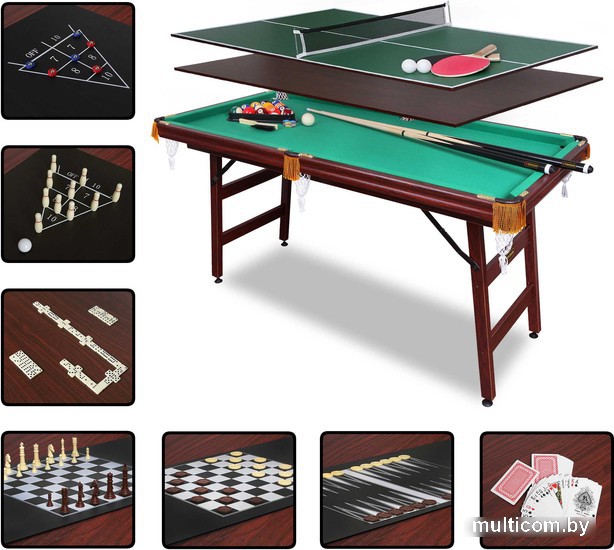 | Комплектация | 1. Для игры в американский пул: - комплект шаров O 51 мм (16 шт.) - треугольник для шаров - 2 кия длиной 121,92 см - 2 мелка Pioner (синие) - щетка для ухода за сукном 2. Для игры в настольный теннис: - игровое поле с нанесенной на него соответствующей разметкой - сетка - теннисные ракетки (2 шт.) - шары для пинг-понга (2 шт.) 3. Для игры в шашки: - игровое поле с нанесенной на него соответствующей разметкой - шашки 2-х цветов (коричневые и белые) по 12 шт. каждого цвета (всего 24 шт.) 4. Для игры в шахматы: - игровое поле с нанесенной на него соответствующей разметкой - шахматные фигуры 2 комплекта разного цвета (коричневые и белые) по 16 фигур каждый (всего 32 шт.) 5. Для игры в нарды: - игровое поле с нанесенной на него соответствующей разметкой - фишки 2-х цветов (коричневые и белые) по 15 шт. каждого цвета (всего 30 шт.) 6. Для игры в кегли: - игровое поле с нанесенной на него соответствующей разметкой - кегли (10 шт.) 7. Для игры в шаффлборд: - игровое поле с нанесенной на него соответствующей разметкой - фишки 2-х цветов (красные и синие) по 3 шт. каждого цвета (всего 6 шт.) 8. Для игры в карты: - комплект пластиковых игральных карт 9. Для игры и домино: - комплект фишек домино (30 х 15 х 5 мм) |