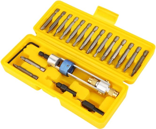 | Комплектация | 1 шт - насадка-твистер 8 шт - биты Phillips: PH0 - 2шт, PH1 - 2шт, PH2 - шт, PH3 - шт 8 шт - биты Slotted: 1/8" 3.2мм - 2шт, 5/32"4мм - 2шт, 3/16"4.8мм - 2шт, 1/4"6.3мм - 2шт 2 шт - сверла: 3/32"2.4мм, 1/8"3.2мм 1 шт - шестигранный ключ Кейс |