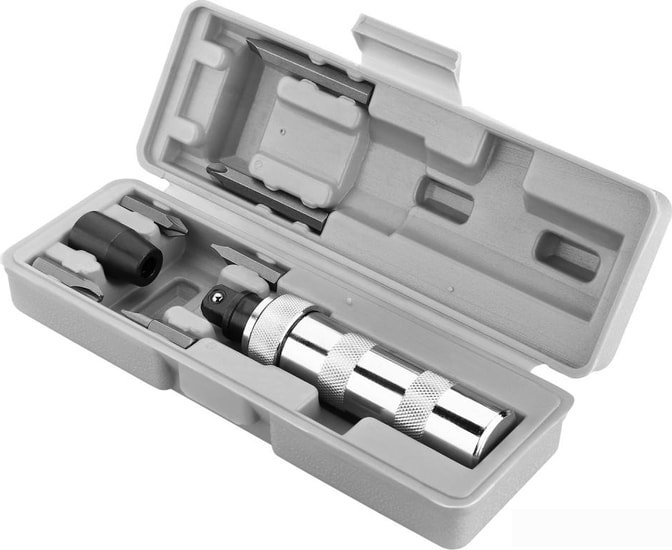 Информация | Ударная отвертка с набором бит в кейсе DEKO TZ7 (7 предметов) служит для откручивания сильно закрученных винтов при помощи ударов по обратной стороне отвертки.Комплект поставляется в компактном пластиковом кейсе.В наборе идут биты 65мм:PH3,SL6 и 35мм:PH3,PH2,SL8,SL6. |