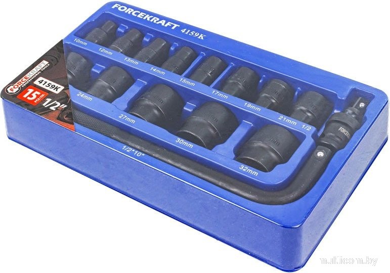 | Комплектация | Торцевые шестигранные головки: 10, 12, 13, 14, 15, 17, 19, 21, 22, 24, 27, 30, 32 мм; кардан; Г-образный вороток; ложемент. |