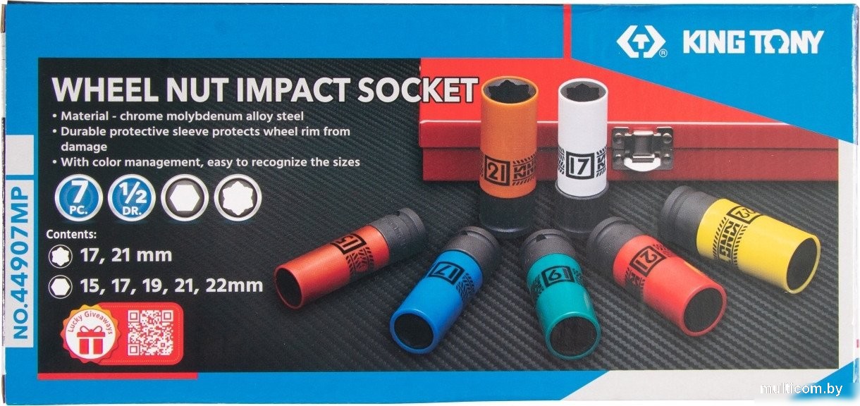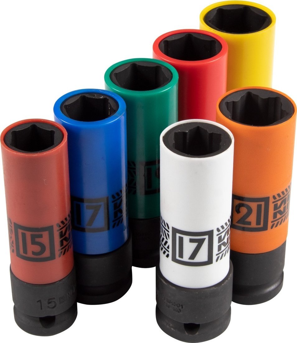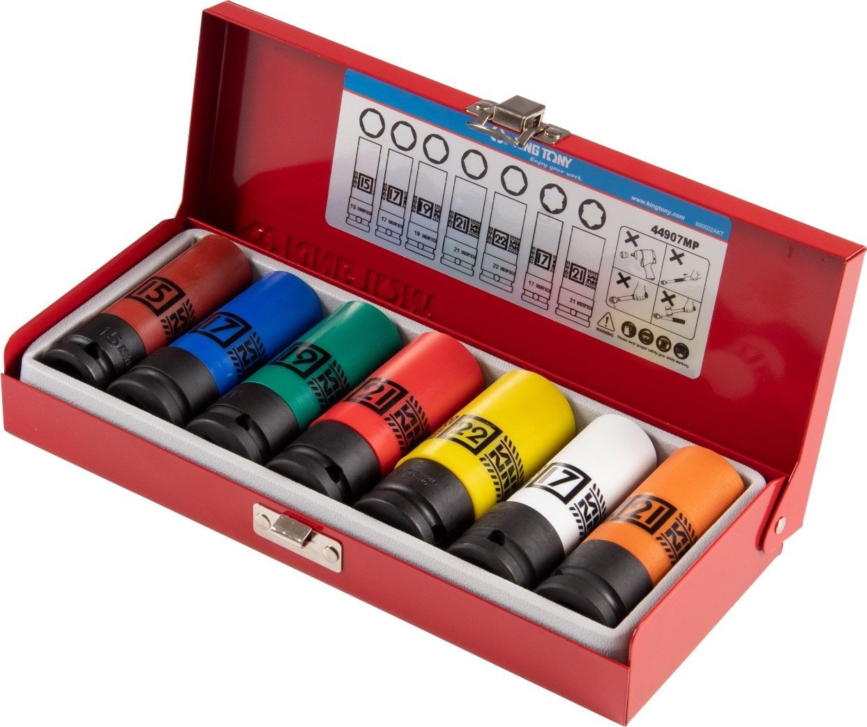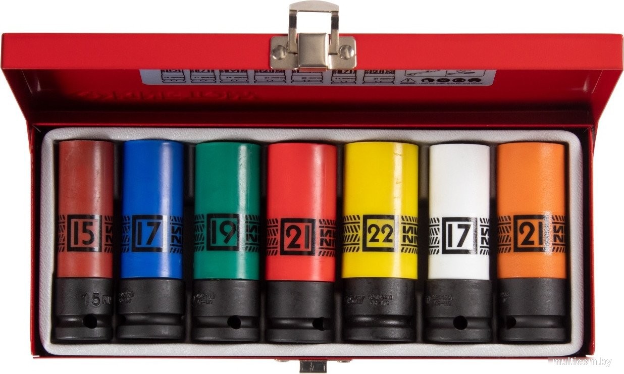 Комплектация | Головки торцевые ударные глубокие тонкостенные с пластиковой защитой – 15, 17, 19, 21, 22 мм; Головка для секретных болтов Mercedes-Benz (17 мм); Головка для секретных болтов Hyundai/KIA (21 мм); Металлический кейс |