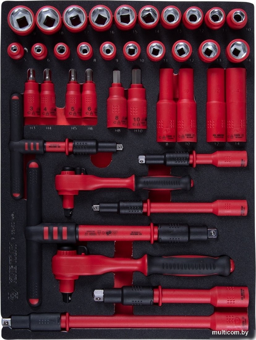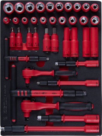 | Комплектация | Головки и принадлежности 3/8" и 1/4" диэлектрические, трещотки, воротки, удлинители, насадки, ложемент |