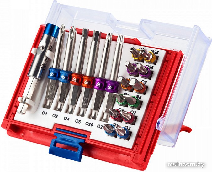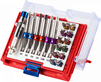Комплектация | - Держатель вставок (бит) с фиксатором / длина 66 мм; - Биты 1/4" (6.35 мм) / длина 25 мм: • крестовые Phillips №1, №2 • крестовые Pozidrive №1, №2 • шлицевые Slotted 4, 6 мм • шестигранные Hex 4, 5 мм • Torx T20, T25 • Torx сотверстием T20H, T25H - Биты 1/4" (6.35 мм) / длина 65 мм: • крестовые Phillips №1, №2 • шестигранные Hex 4, 5 мм • Torx T20, T25 |