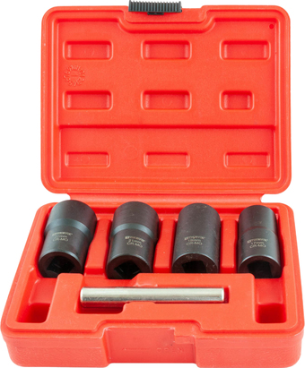 | Комплектация | - Головки торцевые спиральные для поврежденного крепежа - 4 шт.: 17, 19, 21, 22 мм. - Выколотка 12 мм. - Пластиковый кейс. |