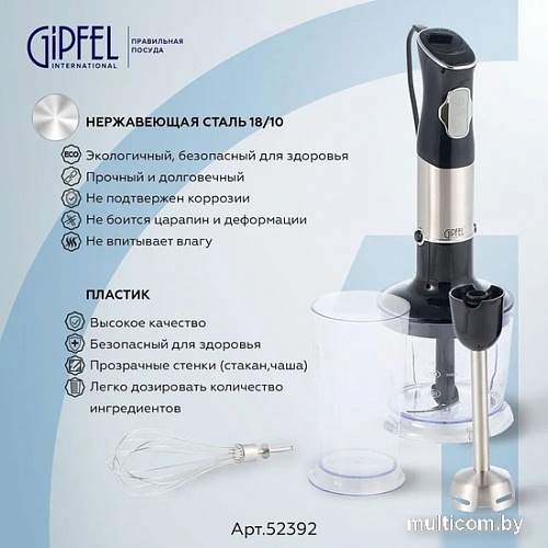 | Информация | Блендер погружной электрический Gipfel Chef 52392. Прибор изготовлен из нержавеющей стали, материала прочного и долговечного и высококачественного пластика. У блендера 4 аксессуара: измельчитель для твердых продуктов; венчик для взбивания; мерный стакан 600 мл; чаша с ножами для измельчения 500 мл. На моторном блоке расположены три кнопки: кнопка включения/выключения, кнопка переключения режимов скоростей от 1 до 5, кнопка турборежима - функция, которая позволяет блендеру в течение короткого времени работать на максимально возможных оборотах. Стакан и чаша прозрачные с мерной шкалой. Блендер выполнен в лаконичном дизайне черного цвета. С помощью блендера можно приготовить вкусный соус, смузи, молочный коктейль, взбить тесто для блинчиков и пышного бисквита, измельчить мясо для котлет, сделать пюре из овощей и фруктов и многое другое. Рекомендации по использованию и уходу: Очищать моторный блок, держатель венчика и крышку чаши влажными салфетками. Остальные части можно мыть в посудомоечной машине. Избегать попадания воды на моторный блок. Отключать прибор перед чисткой, разборкой и сборкой. Не смешивать горячие жидкости. Использовать турборежим не более 30 секунд. |