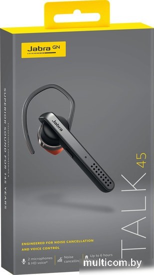 | Комплект поставки | Гарнитура Jabra Talk 45, Кабель микро-USB, 3 комплекта гелевых ушных вкладышей EarGel, 2 наушных крепления EarHook, Краткое руководство пользователя |