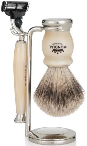 | Информация | Набор из коллекции HAMILTON с помазком Tasso II / Pure badger из натурального превосходного качества барсучьего волоса, станок Gillette Mach 3 Turbо. Материал — смола цвета слоновой кости. |