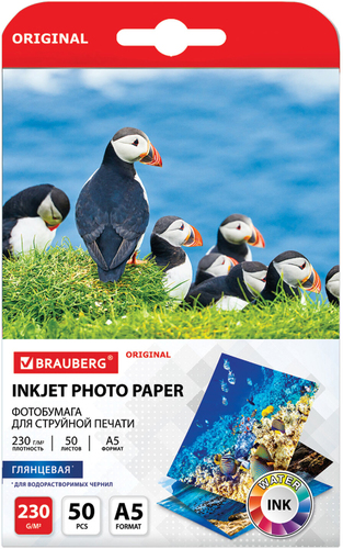 | Информация | Глянцевая односторонняя фотобумага BRAUBERG подходит для всех типов струйных принтеров. Незаменима для печати ярких фотореалистичных изображений. Передает яркие, насыщенные цвета со множеством оттенков. Имеет формат А5 и плотность 230 г/м2, что исключает просвечивание изображения. Гладкая поверхность обеспечивает превосходное качество, а особый состав — идеальную цветопередачу. Печать возможна только водорастворимыми чернилами. Поставляется по 50 листов в картонной упаковке с европодвесом. |