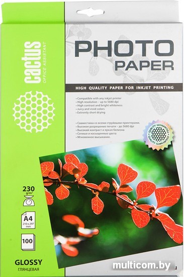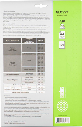 | Информация | Глянцевая фотобумага Cactus представляет собой оптимальное сочетание цены и качества. Она отлично подходит для размещения памятных фотографий в фоторамке или фотоальбоме. Обладая приятным глянцевым блеском, фотобумага Cactus придаст вашим фотографиям и презентациям предельную реалистичность. А высококлассное покрытие позволит добиться максимально точной цветопередачи.Эта фотобумага будет весьма полезна при печати макетов и web-графики. |