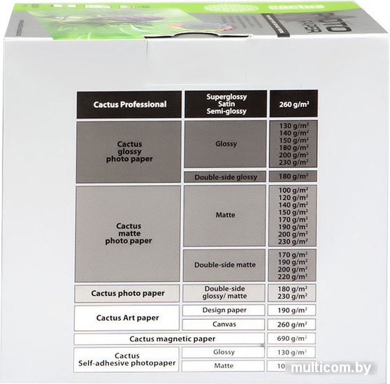 | Информация | Глянцевая фотобумага Cactus представляет собой оптимальное сочетание цены и качества. Она отлично подходит для печати памятных фотографий в фото-рамку или фотоальбом. Обладая приятным глянцевым блеском, она украсит ваши фотографии и презентации. А высококлассное покрытие позволит добиться максимально точной цветопередачи, что будет полезно при печати макетов и web-графики. |