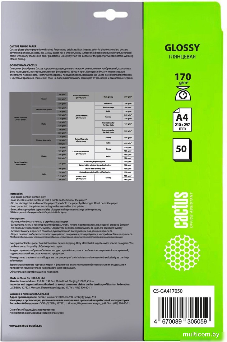 | Информация | ??Текст описания составлен при помощи искусственного интеллекта. - Фотобумага CACTUS Глянцевая A4 170 г/м2 50 листов CS-GA417050 идеально подходит для струйной печати высокого разрешения до 5680 dpi. - Благодаря глянцевой поверхности, каждый отпечаток будет иметь яркие и насыщенные цвета, а также четкие детали. - Поверхностная плотность 170 г/кв.м. обеспечивает прочность и устойчивость бумаги к истиранию, что делает ее идеальным выбором для фотографий и изображений. - Упаковка содержит 50 листов формата A4, что обеспечивает достаточное количество материала для печати большого количества фотографий или документов. - Фотобумага CACTUS Глянцевая A4 170 г/м2 50 листов CS-GA417050 - отличный выбор для тех, кто ценит качество печати и долговечность материала. |