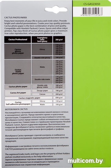 | Информация | Глянцевая фотобумага Cactus представляет собой оптимальное сочетание цены и качества. Она отлично подходит для печати памятных фотографий в фото-рамку или фотоальбом. Обладая приятным глянцевым блеском, она украсит ваши фотографии и презентации. А высококлассное покрытие позволит добиться максимально точной цветопередачи, что будет полезно при печати макетов и web-графики. |
