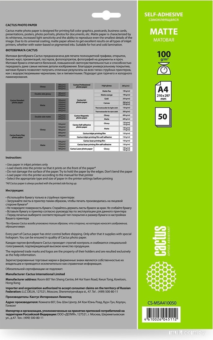 | Информация | ??Текст описания составлен при помощи искусственного интеллекта. - Самоклеящаяся бумага CACTUS матовая A4 100г/м2 50 л CS-MSA410050 идеально подходит для струйной печати. - Ее матовая поверхность обеспечивает высокое качество печати и отличное впитывание чернил. - Самоклеящаяся основа позволяет легко прикрепить напечатанные листы к различным поверхностям без использования клея. - Упаковка содержит 50 листов формата A4, что делает эту бумагу удобной и экономичной в использовании. - Благодаря максимальному разрешению печати 5680 dpi, вы получите четкие и яркие изображения на каждом листе. - Надежная и универсальная самоклеящаяся бумага CACTUS матовая A4 100г/м2 50 л CS-MSA410050 - отличный выбор для различных видов печати и творческих проектов. |
