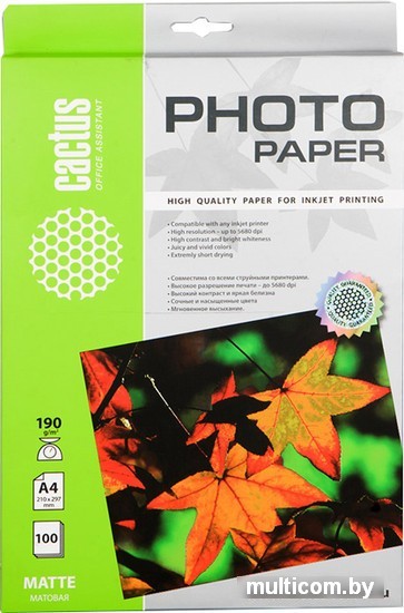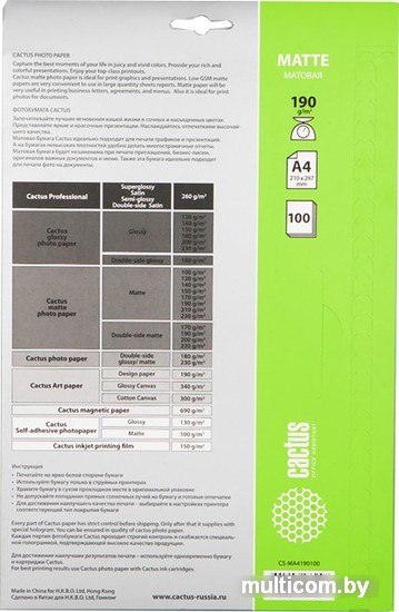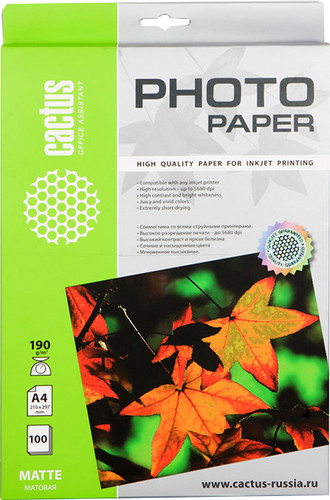 | Информация | Матовая бумага Cactus отлично подходит для печати графиков и презентаций. На этих бумагах невысокой плотности особенно удобно делать многостраничные отчеты. Матовая фактура без бликов незаменима при печати приглашений, бизнес-писем, оригиналов важных документов и меню, идеально подходит для печати фото на документы. |
