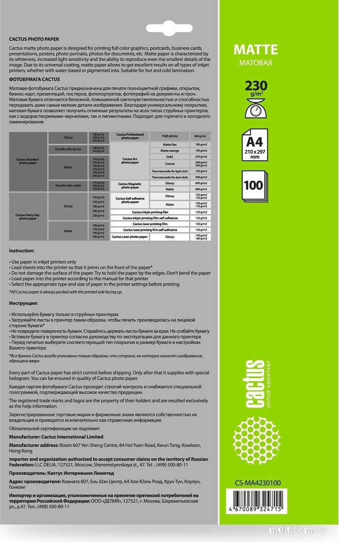 | Информация | ??Текст описания составлен при помощи искусственного интеллекта. - Фотобумага CACTUS Матовая A4 230 г/кв.м. 100 листов CS-MA4230100 идеально подходит для струйной печати. - С ее высокой белизной (CIE 95) и максимальным разрешением печати 5680 dpi вы получите отличное качество изображений. - Поверхностная плотность 230 г/кв.м. обеспечивает прочность и устойчивость фотобумаги. - Упаковка содержит 100 листов формата A4, что делает ее отличным выбором для профессионального использования. |