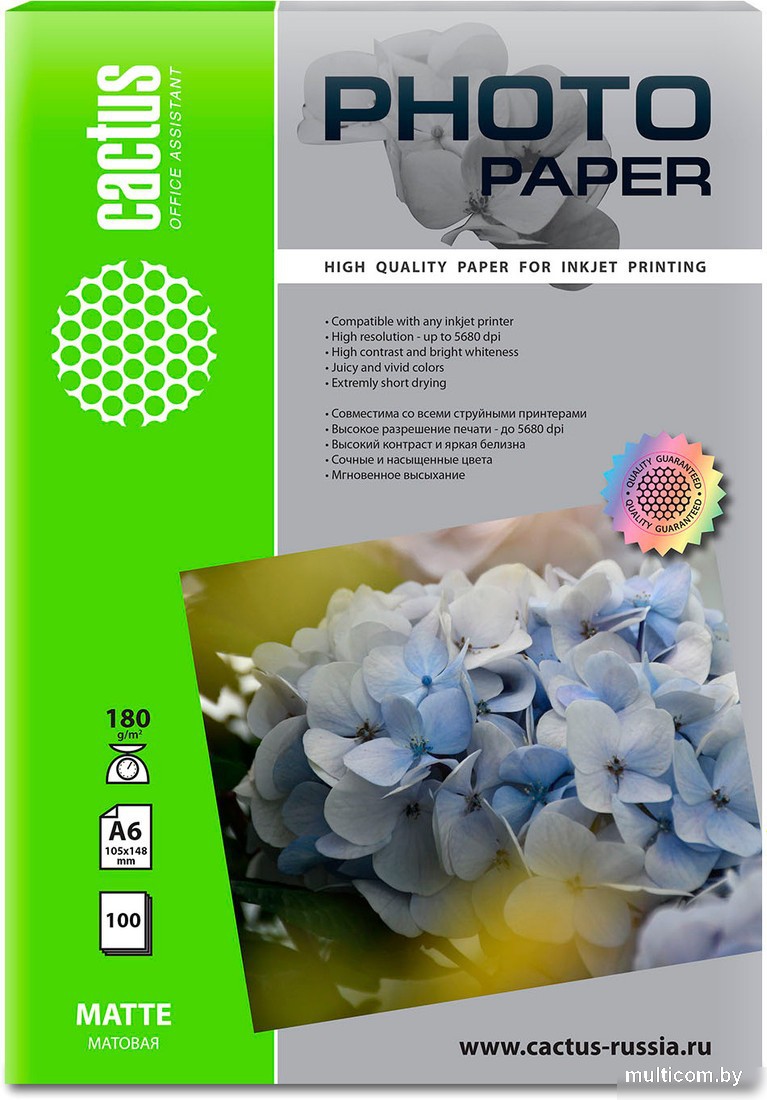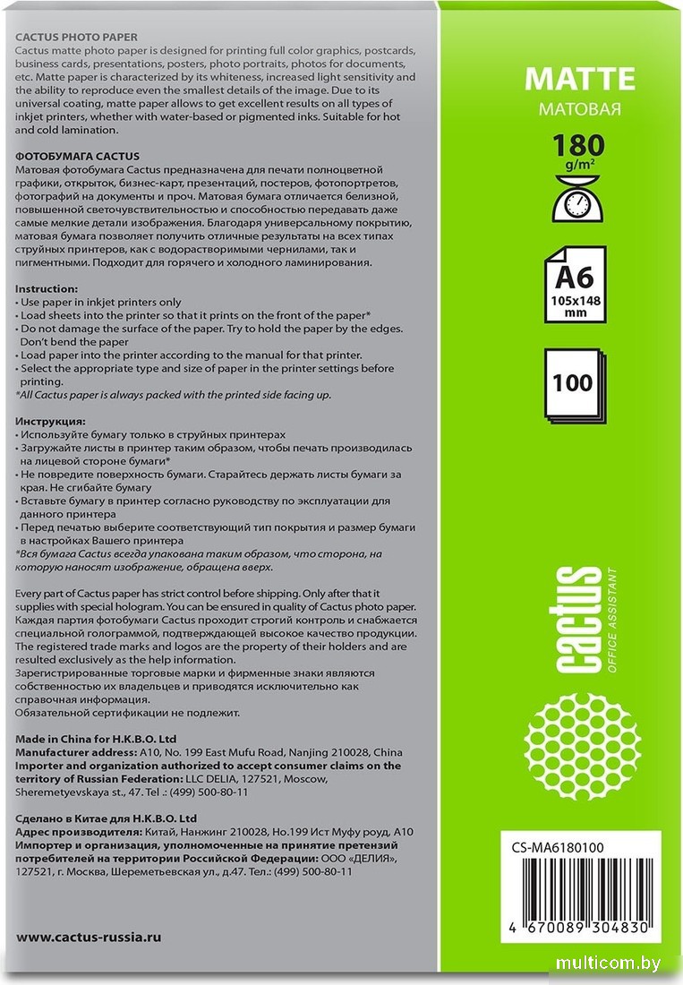 | Информация | ??Текст описания составлен при помощи искусственного интеллекта. - Фотобумага CACTUS Матовая A6 10x15 180 г/м2 100 листов CS-MA6180100 идеально подходит для струйной печати фотографий и изображений. - С ее помощью вы сможете получить высококачественные отпечатки с максимальным разрешением до 5680 dpi. - Благодаря матовой поверхности бумаги, цвета на фотографиях будут выглядеть естественно и насыщенно. - Упаковка содержит 100 листов формата A6 (10x15), что позволяет вам распечатать большое количество фотографий без необходимости постоянно покупать новую бумагу. - Фотобумага CACTUS Матовая A6 10x15 180 г/м2 100 листов CS-MA6180100 обладает поверхностной плотностью 180 г/кв.м., что делает ее прочной и устойчивой к повреждениям во время печати и использования. |