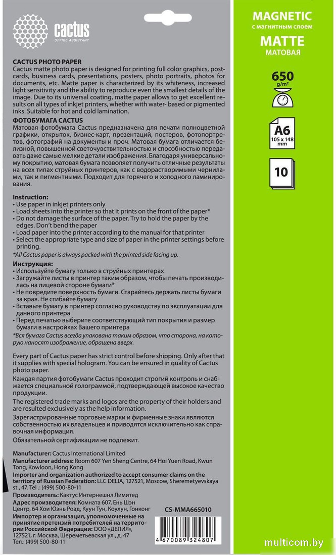 | Информация | ??Текст описания составлен при помощи искусственного интеллекта. - Бумага с магнитным слоем CACTUS матовая A6 650г/м2 10 л CS-MMA665010 идеально подходит для струйной печати формата A6 (10x15). - Ее поверхностная плотность составляет 650 г/кв.м., что обеспечивает высокое качество печати с максимальным разрешением до 5680 dpi. - Упаковка содержит 10 листов бумаги, каждый из которых обладает матовой поверхностью для создания четких и насыщенных изображений. - Благодаря магнитному слою, эту бумагу легко использовать для создания магнитов, открыток, пригласительных и других творческих проектов. - Бумага с магнитным слоем CACTUS матовая A6 650г/м2 10 л CS-MMA665010 - отличный выбор для тех, кто ценит качество и удобство в работе с печатными материалами. |