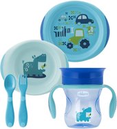 | Информация | - Первый набор посуды малыша, как у мамы и папы. - Поильник непроливайка Perfect Cup помогает развивать навыки питья из чашки, не допуская проливания. - Набор столовых приборов First Cutlery способствует тому, чтобы ребенок учился кушать самостоятельно. - Набор из двух тарелок Dish Set обеспечивает максимальный комфорт во время приема пищи. - Набор посуды Meal set украшен забавными рисунками, которые стимулируют аппетит и развивают воображение. - Не упустите возможность сделать кормление вашего малыша более увлекательным! |