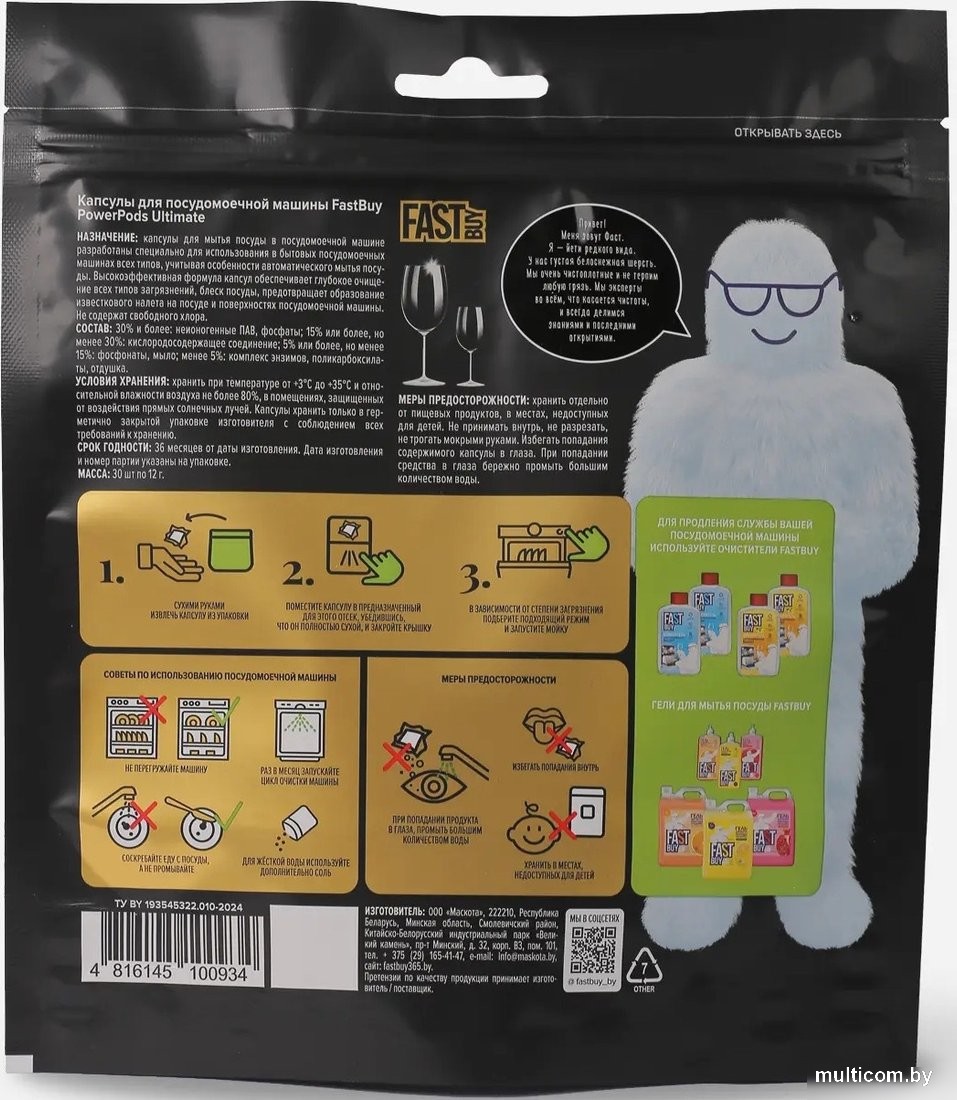 | Информация | - Высокоэффективная формула капсул обеспечивает глубокое очищение всех типов загрязнений, блеск посуды, предотвращает образование известкового налета на посуде и поверхностях посудомоечной машины. Не содержат свободного хлора. - Устали от разводов, жирных пятен и накипи на посуде? Капсулы для посудомойки с формулой антижир растворят даже засохшие загрязнения. Очистят от жира даже в холодной воде на эко цикле. Средство 3 в 1 содержит соль, ополаскиватель и порошок. - Универсальные капсулы Fast Buy предотвращают образование накипи на посуде и внутренних деталях ПММ, продлевая срок службы. Безопасный состав таблеток — не содержат свободного хлора. Подходят для стекла и хрупких материалов. Одна капсула — 1 загрузка. Водорастворимая оболочка. Просто загрузите в сухой отсек и запустите цикл! - |