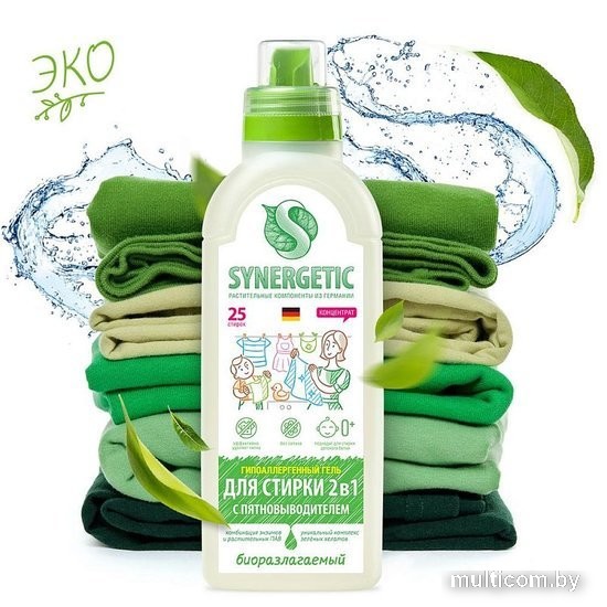 | Информация | Концентрированный гель с улучшенной формулой для стирки одежды самых непоседливых взрослых и детей. Если на одежде целая куча разных пятен, не застирывайте их по отдельности — просто закиньте все в машинку, а остальное SYNERGETIC берет на себя. |