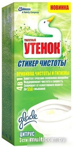 | Информация | Стикер для унитаза ТУАЛЕТНЫЙ УТЕНОК Цитрус 3 штуки (8991030536) – гигиеничный и простой способ поддерживать туалет чистым и свежим. Отсутствие корпуса не дает скапливаться бактериям. Не нужно заменять и прикасаться к грязным блокам. Клеится только на сухую поверхность. Постепенно растворяясь в воде, обеспечивает чистоту и свежесть при каждом смывании. Одной упаковки Стикера чистоты (3 шт) хватает до 550 смываний. Действующее вещество полимер Мирапол образует защитный слой на поверхности унитаза, препятствующий образованию минеральных отложений, являющихся очагами скопления микробов. |