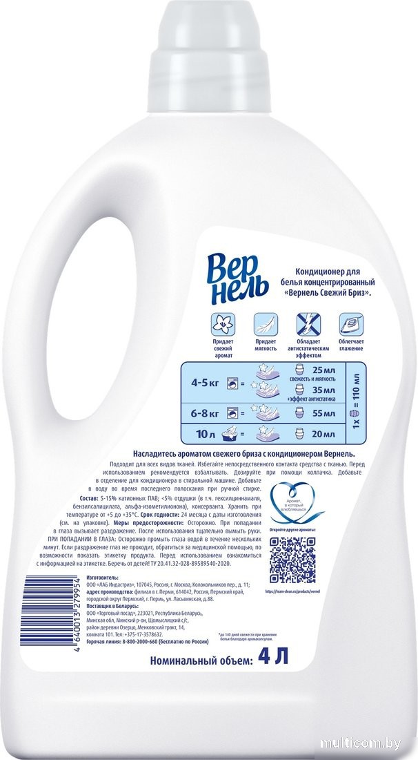 | Информация | - Концентрированный кондиционер для белья Vernel Свежий Бриз объемом 4 л (на 160 стирок) подарит вашему белью невероятную мягкость и освежающий аромат. Этот кондиционер для стирки станет отличным помощником в уходе за вашим текстилем. - Благодаря своей концентрированной формуле, кондиционер Vernel обеспечивает не только мягкость, но и длительную свежесть. Специальные аромакапсулы в составе позволяют наслаждаться насыщенным ароматом белья до 140 дней, что делает его идеальным выбором для тех, кто ценит качество и долговечность. - Использование кондиционера для стирки Vernel значительно облегчает процесс глажки и обладает антистатическим эффектом, что особенно важно для синтетических тканей. Он подходит для регулярного ухода за бельем и прост в использовании. - Для одной стирки достаточно менее половины колпачка средства, что делает его экономичным вариантом. Удобная крышка-дозатор поможет точно отмерить необходимое количество кондиционера, чтобы вы всегда могли наслаждаться свежестью и мягкостью вашего белья. - Выбирайте Vernel Свежий Бриз для идеального ухода за вашим текстилем и наслаждайтесь качеством, которое вы заслуживаете! |