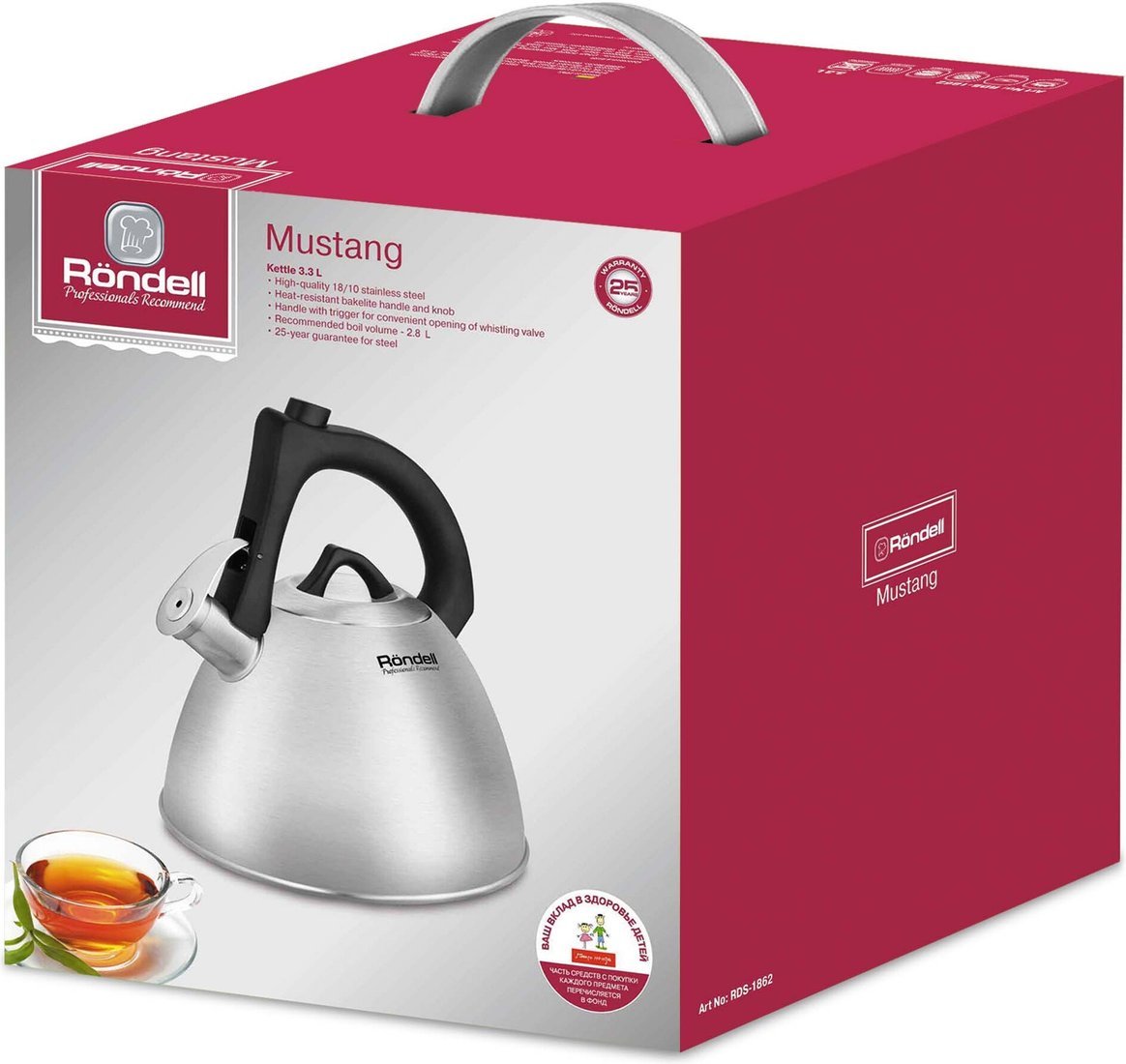 | Информация | - Чайник Rondell Mustang RDS-1862 - это стильная и практичная модель из нержавеющей стали с сатинированной полировкой, рассчитанная на объем 3.3 л. Его элегантный внешний вид гармонично сочетается с прочной конструкцией и продуманными деталями, что позволяет выделить его среди других кухонных аксессуаров. - Эргономичная бакелитовая ручка с покрытием soft touch обеспечивает надежный и комфортный захват, а устройство для открытия носика, размещенное прямо на ручке, делает процесс наливания воды особенно удобным и безопасным. Бакелитовые элементы не нагреваются, что исключает риск ожогов. - Свисток с сердцевиной из стали оповещает о закипании воды, а благодаря уникальному механизму открывания на ручке можно наливать воду одной рукой. Чайник подходит для всех типов плит, включая индукционные, что делает его универсальным помощником на любой современной кухне. - В комплекте идет подарочная упаковка с ручкой, что делает этот чайник отличным выбором не только для собственного использования, но и в качестве подарка. Надежность, продуманность конструкции и изысканный внешний вид делают Rondell Mustang настоящим украшением кухни. |
