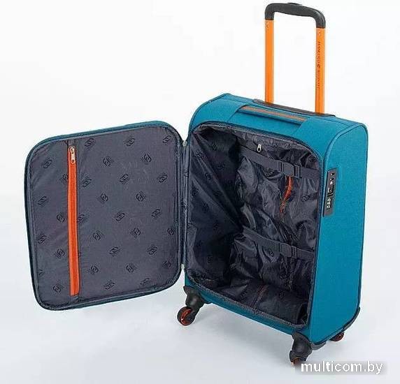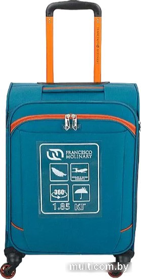 | Информация | Облегченный чемодан-спиннер от торговой марки Francesco Molinary из практичного полиэстера с водоотталкивающей пропиткой бирюзового цвета с оранжевыми деталями. Модель на четырех колесах, с выдвижной телескопической ручкой и ручкой-переноской сверху; имеется кодовый замок TSA. Отделение на молнии. Внутри: фирменная подкладка. На крышке – карман на молнии; в глубоком отделении – эластичные ремни для фиксации багажа. На лицевой стороне – карман на молнии. |