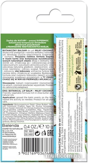 | Информация | Дружественная растительная формула, богатая маслом карите и составом отборных натуральных масел, ухаживает за нежной кожей губ, смягчает ее и защищает от неблагоприятных погодных условий. Губы возвращают свою естественную гладкость, эластичность, правильное увлажнение и здоровый вид. Регенерирующее и питательное кокосовое масло усиливает барьерные функции кожи, смягчает и разглаживает ее. Бальзам НЕ окрашен, имеет натуральный цвет и прекрасный кокосовый аромат. |