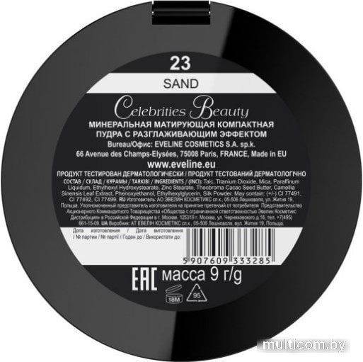 | Информация | Новая эксклюзивная маскирующе-матирующая минеральная компактная пудра Celebrities Beauty содержит натуральные компоненты, которые придают коже сияющий вид и эксклюзивный комплексный уход. Тончайшая бархатистая текстура пудры обеспечивает легкость нанесения и придает коже прозрачную матовость и однородность. Превосходно маскирует недостатки и абсорбирует излишки жира с поверхности кожи, не пересушивая ее. Формула OIL FREE не блокирует поры и позволяет коже свободно дышать. |