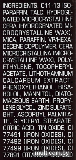 | Состав | C11-13 ISOPARAFFIN, TALC, HYDROGENATED MICROCRYSTALLINE CERA (HYDROGENATED MICROCRYSTALLINE WAX), MICA, PARAFFIN, VP/HEXADECENE COPOLYMER, CERA MICROCRISTALLINA (MICROCRYSTALLINE WAX), POLYETHYLENE, TOCOPHERYL ACETATE, LITHOTHAMNIUM CALCAREUM EXTRACT, PHENOXYETHANOL, BISABOLOL, MANNITOL, DIATOMACEOUS EARTH, PROPYLENE GLYCOL, ZINC SULFATE, TIN OXIDE, BHT, ASCORBYL PALMITATE, GLYCERYL STEARATE, CITRIC ACID, CI 77491 (IRON OXIDES), CI 77492 (IRON OXIDES), CI 77499 (IRON OXIDES), CI 77891 (TITANIUM DIOXIDE) |