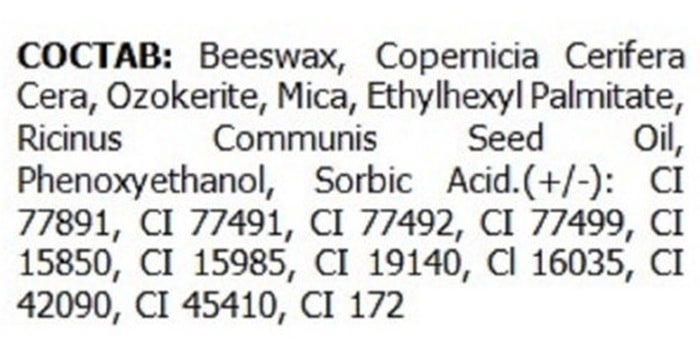 | Состав | Aqua, Synthetic Beeswax, Paraffin, CI 77499, Acacia Senegal Gum, Stearic Acid, Triethanolamine, Palmitic Acid, Butylene Glycol, Copernicia Cerifera Cera, Glyceryl Stearate, Polybutene, VP/Eicosene Copolymer, Oryza Sativa Bran Wax |