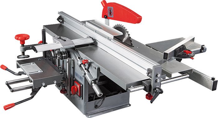 Комплект поставки | Пильный диск по дереву Z40Упор для пиления и фугованияПодвижный стол (каретка)Упор подвижного столаКомплект ножей (установлен на валу)Ограждение ножевого валаПазовальный стол в комплекте с прижимом заготовкиСверлильный патрон |