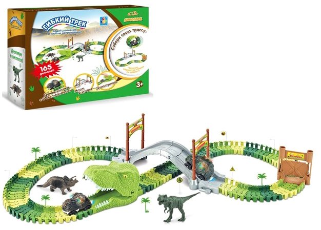 | Информация | Игрушка Гибкий трек Динопарк 1toy Т20859. Наборы серии Гибкий трек задают новый тренд традиционной игре с машинками. Дорогу можно не просто собрать так, чтобы она поворачивала и петляла в разные стороны благодаря специальным деталям-рельсам, но также сделать выпуклой или вогнутой или вообще закольцевать, заставив машинку ехать внутри нее, словно хомячка внутри специального круга. |